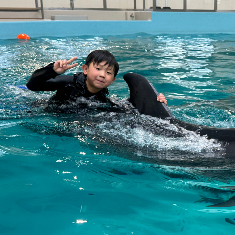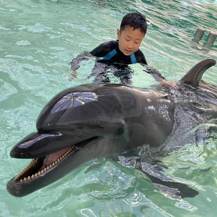 さらに、トレーナーからイルカやトレーニングのお話、浅瀬でのふれあいや背鰭につかまって泳ぐライド体験、